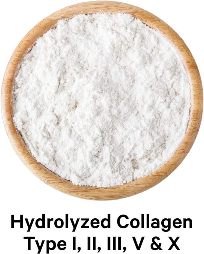 Hydrolyzed Bovine Collagen Peptides, Eggshell Membrane Collagen, Organic Ashwagandha Extract (root and leaf), Hydrolyzed Fish Collagen Peptides, Chicken Bone Broth Collagen Concentrate, Organic Amal Berry Extract. Other Ingredients: Plant Cellulose
