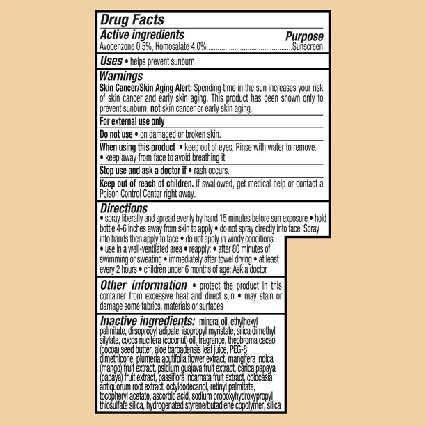 Active Ingredients: Avobenzone 0.5%, Homosalate 4.0% Inactive Ingredients: mineral oil, ethylhexyl palmitate, diisopropyl adipate, isopropyl myristate, silica dimethyl silylate, cocos nucifera (coconut) oil, fragrance, theobroma cacao (cocoa) seed butter, aloe barbadensis leaf juice, peg-8 dimethicone, plumeria acutifolia flower extract, mangifera indica (mango) fruit extract, psidium guajava fruit extract, carica papaya (papaya) fruit extract, passiflora incarnata fruit extract, colocasia antiquorum root extract, octyldodecanol, retinyl palmitate, tocopheryl acetate, ascorbic acid, sodium propoxyhydroxypropyl thiosulfate silica, hydrogenated styrene/butadiene copolymer, silica.