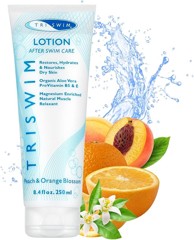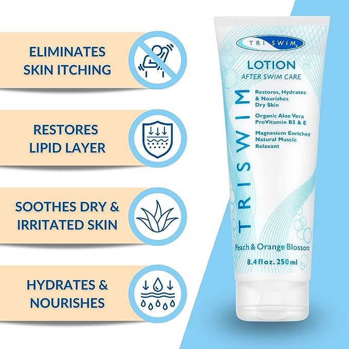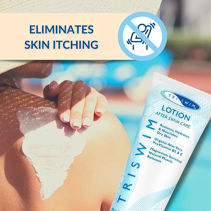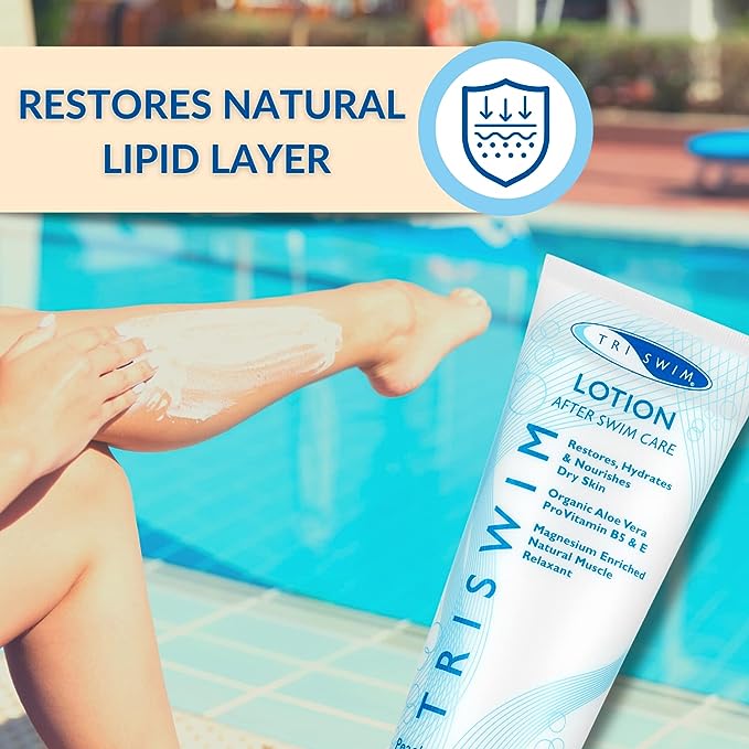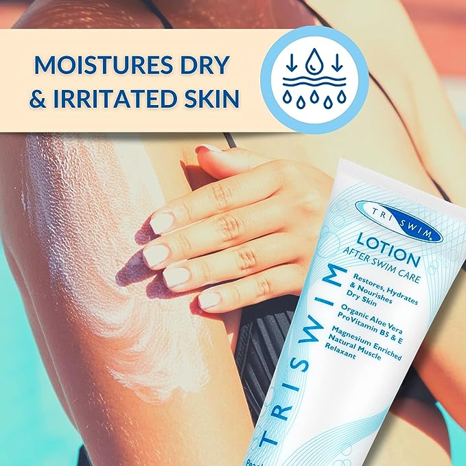 Natural ingredients including Aloe Vera extract, helps the skin to regenerate. TRISWIM Lotion improves skin condition thanks to Vitamin E and Provitamin B5 which relieves skin from dryness caused by Chlorine, Bromine, Saltwater, Hard Water Minerals and Sun. An added benefit is TRISWIM Lotion hydrates all skin and helps relieve irritations caused by sun burns and rash.